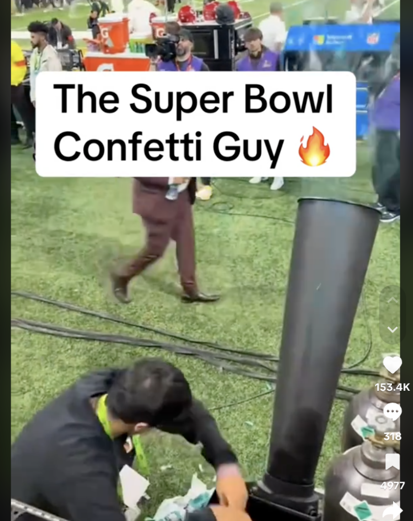 This year’s Super Bowl was a perfect example. One of the biggest social media hits of the night didn’t come from a game highlight or a player interview—it came from bknown agency owner Brendan Kaminsky, who happened to capture a totally unique perspective: the confetti guy loading the machine before it blasted onto the field.